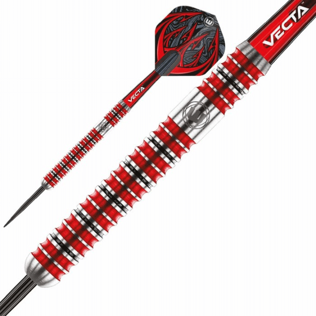 De parallel (rechte) barrel biedt een consistente grip over de volledige lengte, wat zorgt voor een stabiele en herhaalbare worp. Het strakke zilveren design wordt versterkt door stijlvolle rode accenten, wat deze darts een krachtige en sportieve uitstraling geeft.
